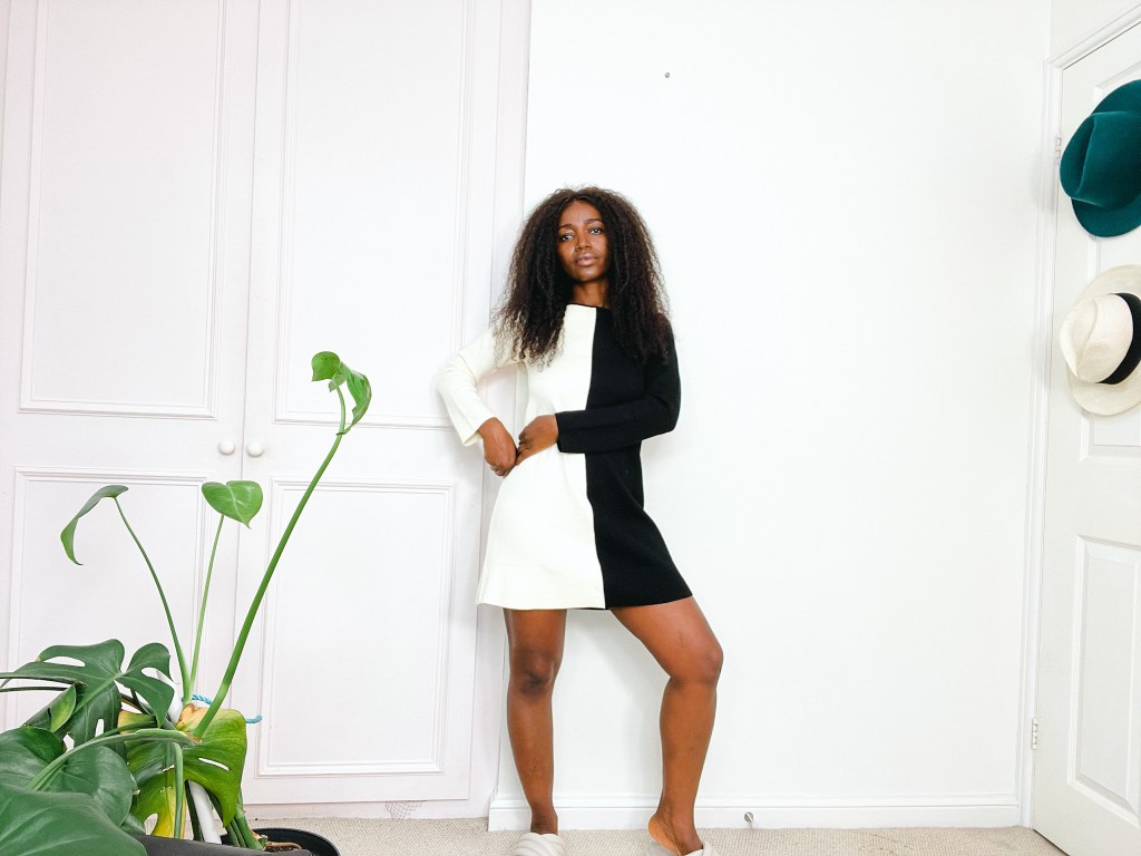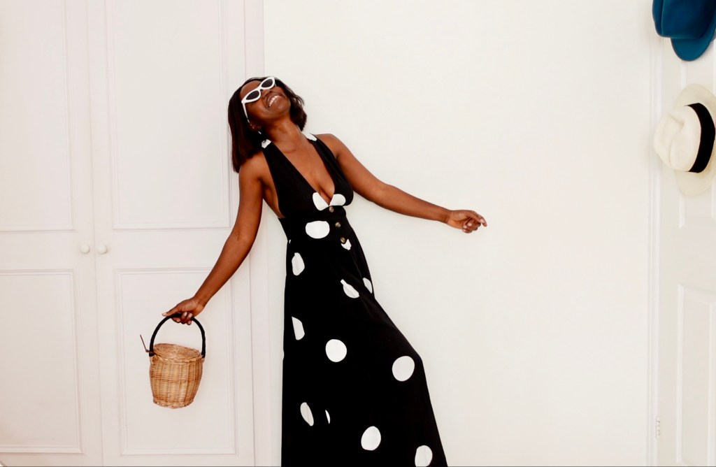 So it’s got a mini shoulder pad which gives it 90’s Bobby Brown era vibe. It’s gathered around the waist, the fabric is stretchy, and i love the length.